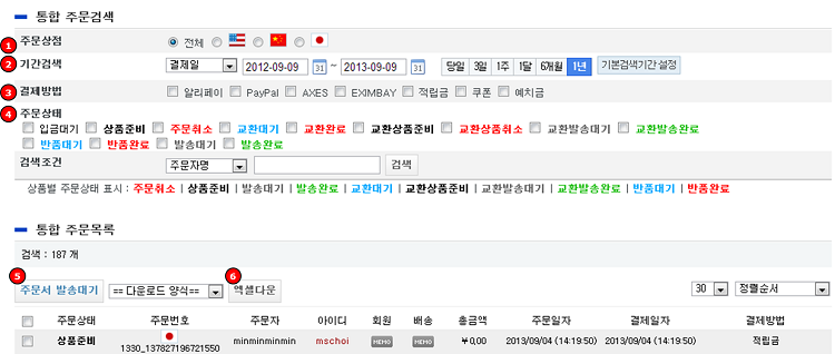 - ④ 주문상태 : - 주문상태에 따라 검색 조건을 정하여 주문리스트 검색이 가능합니다.