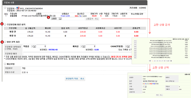 - ② 취소 상품 내역 : - 주문수정 할 상품 내역 설정 부분입니다.(옵션 및 수량 변경가능)