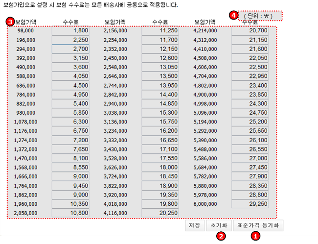 - ※ 최초 상점설정 시 표준가격 동기화를 이용하시고, 표준가격 오류나 부득이한 수수료 수정을 제외하고는 임의로 초기화,수정,삭제 하지 않는 것이 좋습니다.