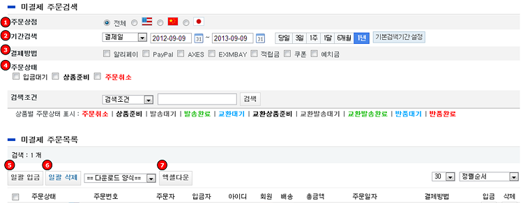 - ⑤ 일괄입금 : - 선택 주문 일괄 입금으로 검색하실 수 있습니다.
