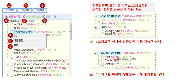 - ① 트리저장 : - 상품분류를 추가, 이름변경, 삭제, 위치이동 등의 변경작업을 실제로 저장합니다.
