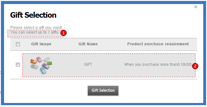 - 사은품분류가 2개 이상 중복적용되더라도 사은품분류 별로 개수제한이 되는 것이 아니라 사은품 분류와 상관없이 선택가능한 전체 사은품에서 개수를 제한합니다.