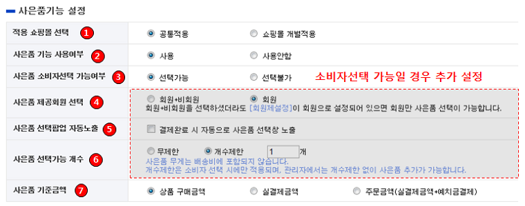 - 회원+비회원을 선택하셨더라도 [회원제설정]이 회원으로 설정되어 있으면 회원만 사은품 선택이 가능합니다.