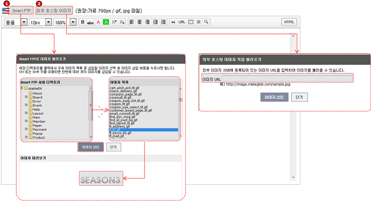 - -먼저 FTP에 이미지를 업로드 해주시기 바랍니다.(디자인센터 > Smart FTP 실행 > 이미지 업로드)