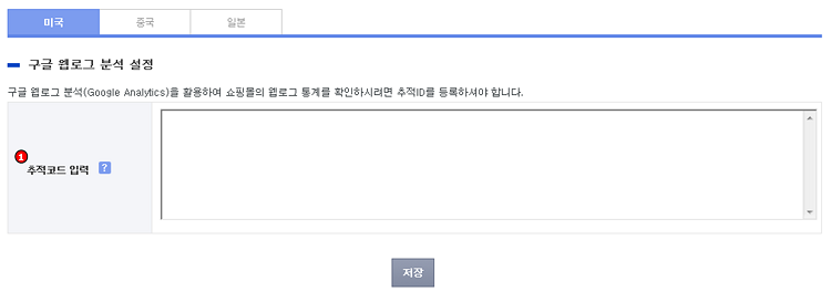 - ① 구글 웹로그 분석 설정 : - 구글 웹로그 분석 사이트(http://www.google.co.kr/intl/ko/analytics/)에서 할당받으신 추적 ID를 입력하는 부분입니다. 쇼핑몰 전체 페이지의 html 소스 태그 안에 삽입됩니다.