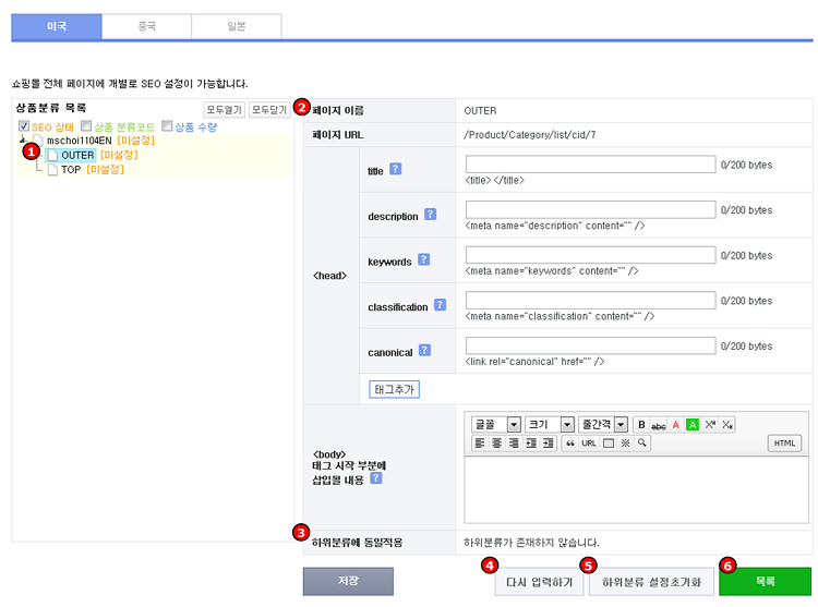 - ③ 하위분류에 동일적용 : - 하위분류에 SEO설정을 동일 적용할 수 있습니다.