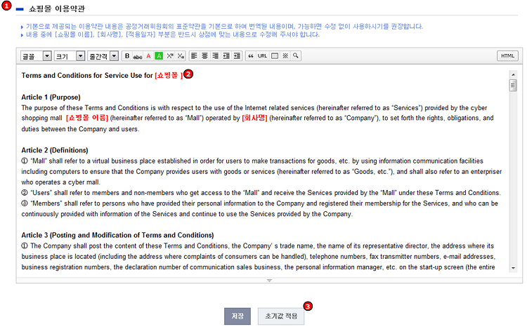 - ※ 기본으로 제공되는 이용약관 내용은 공정거래위원회의 표준약관을 기본으로 하여 번역된 내용이며, 가능하면 수정 없이 사용하시기를 권장합니다.
