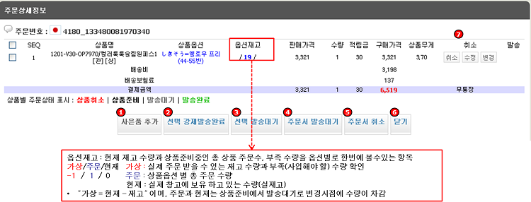 - ② 선택 강제발송완료 : - 주문상세정보에서 상품 선택하여 선택된 상품 강제 발송 기능입니다.
