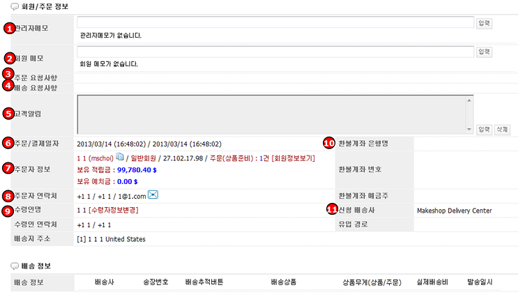 - ⑧ 주문자 연락처 : - 주문자의 연락처와 메일 확인가능합니다.