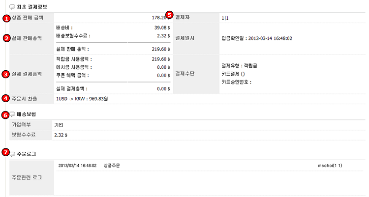 - ③ 실제 결제총액 : - 적립금, 예치금, 쿠폰사용으로 인한 실제로 고객이 결제를 한 금액입니다.