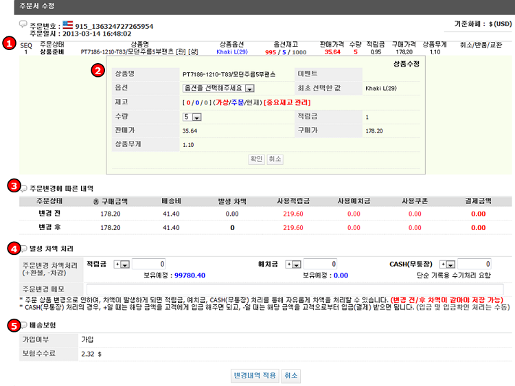 - ⑤ 배송 보험 : - 배송 보험 수수료 안내 부분입니다.