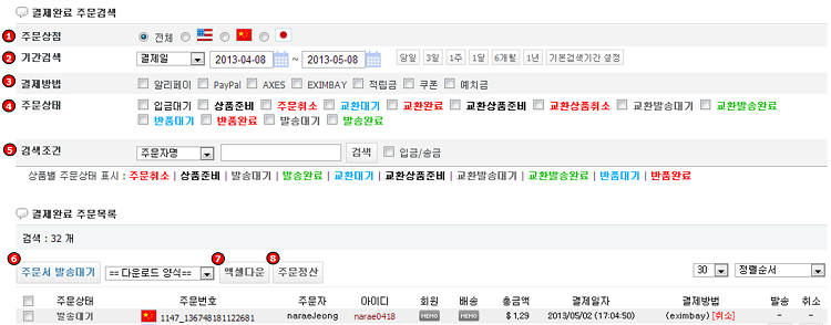 - ① 주문상점 : - 국가별로 결제완료주문 리스트를 검색하실 수 있습니다.