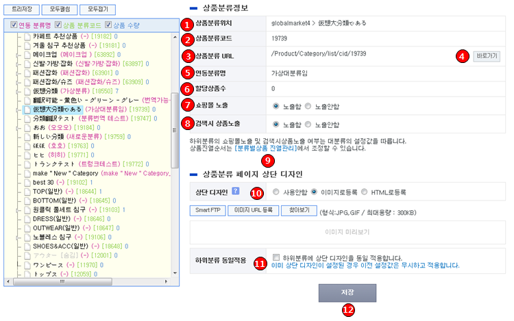 - ⑫ 저장 : - 저장 버튼을 클릭하셔서 상품분류 설정 정보를 저장합니다.