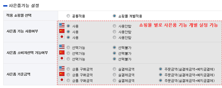 - ※ 쇼핑몰 별로 사은품 기능을 개별 설정할 수 있으며, 설정방법은 공통적용과 동일합니다.