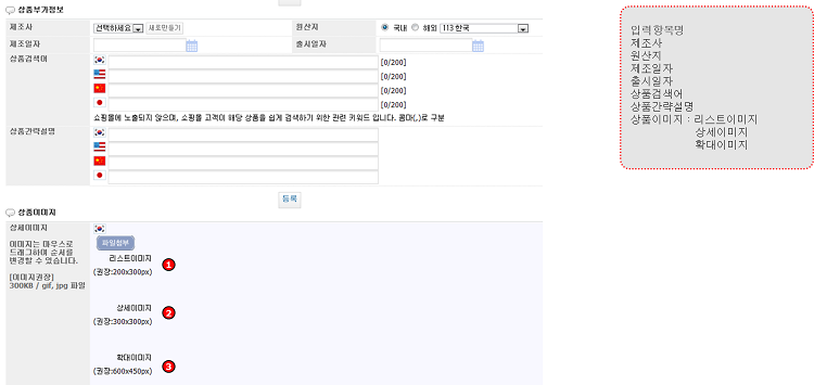 - 상품을 등록할 쇼핑몰 언어에 체크하시면 하단 상품정보 입력항목이 언어별로 입력할 수 있도록 표시됩니다.