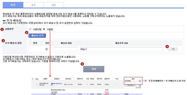 - ⑤ 저장 : - 추가배송사를 저장합니다.