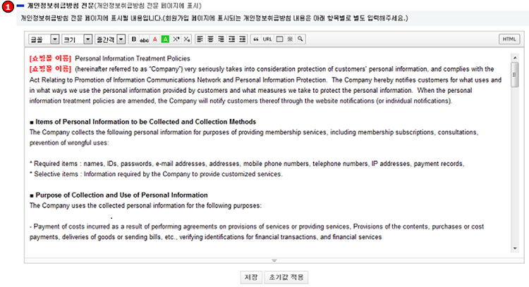 - - 개인정보 처리방침의 빨간부분을 상점에 맞게 입력한 후, 개인정보 수집이용 동의 전문 하단 초기값 적용 버튼을 클릭하면 개인정보 개인정보처리방침에 필요부분이 자동으로 붙여넣기 되어집니다.
