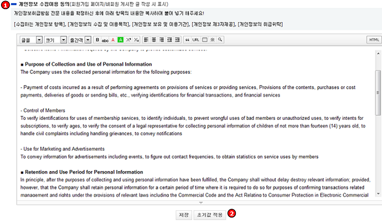 - ② 초기값 적용 : -수동 입력을 위해서는 개인정보 처리방침의 [수집하는 개인정보 항목],[개인정보의 수집 및 이용목적],[개인정보 보유 및 이용기간],[개인정보 제 3자제공], [개인정보의 취입위탁]부분만 붙여넣기해서 넣어주시기 바랍니다.